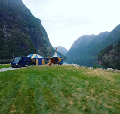 Time to go back to one of my favourite places in the world! Gudvangen, Norway! Every year in juli the Gudvangen viking market is held so me and some friend did the very long drive there pasing lakes, crossing mountains and driving though horrible long tunnels! A beutiful but hard road to drive but then you get to see the deep fjords. Such amaze!Now we will have this wiev for a week or so, not painful at all!Next morning I woke up in my van to this and started setting up the tent.Mountains on all sides and a glaciar river going through the village. Very cold.All set for the viking market! -